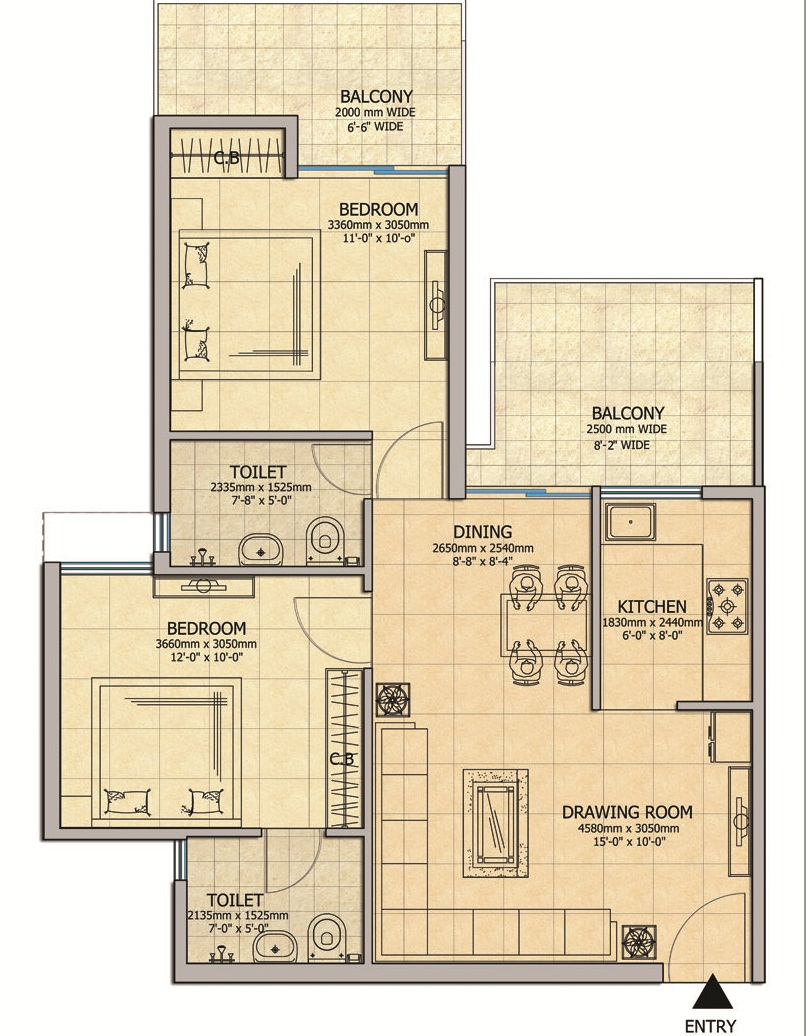 | Flat size : 955 Sq.ft - 1665 Sq.ft |